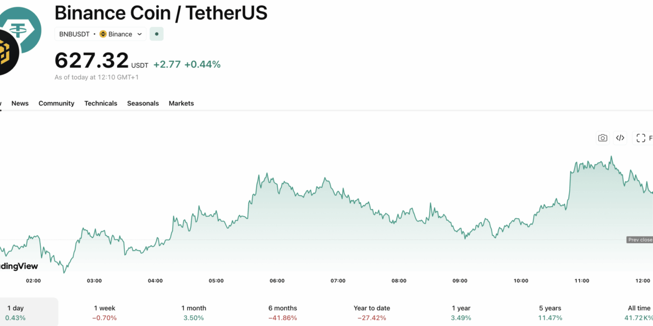 This advancement comes as BNB has moved modestly by +1% over the past 24 hours, trading at $627, with daily trading volume hitting $838M. The Binance-backed asset has been trading in a tight range, evidenced by its 30-day gain of just +1.2%.