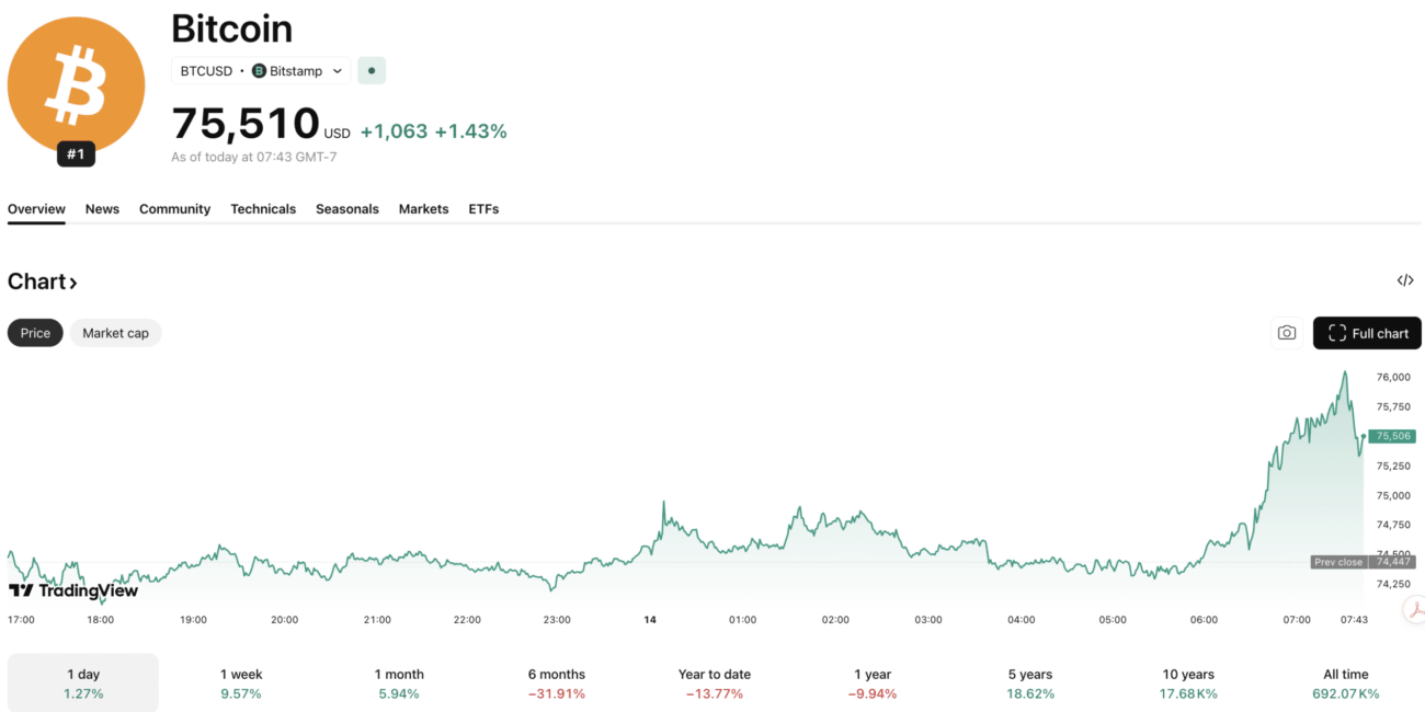All of that is publicly confirmed. What X has refused to confirm or deny is whether blockchain infrastructure runs underneath any of it. However, the crypto market has bounced on Bier’s tease, with Bitcoin USD surging more than +5% overnight to $75,000.