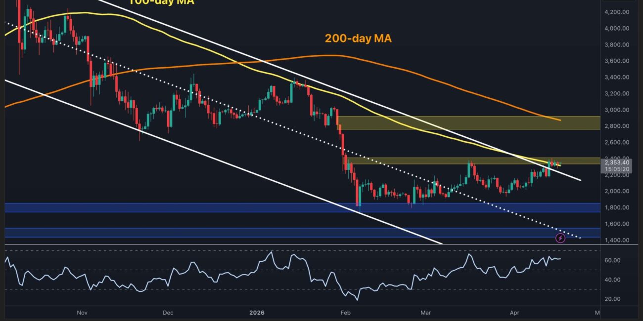 The key test now is whether ETH can convert this into a valid breakout above the $2.4k level and the 100-day moving average. The $2.8k zone above represents the next major supply corridor, with the declining 200-day MA (~$2.9k) located at its upper boundary.
