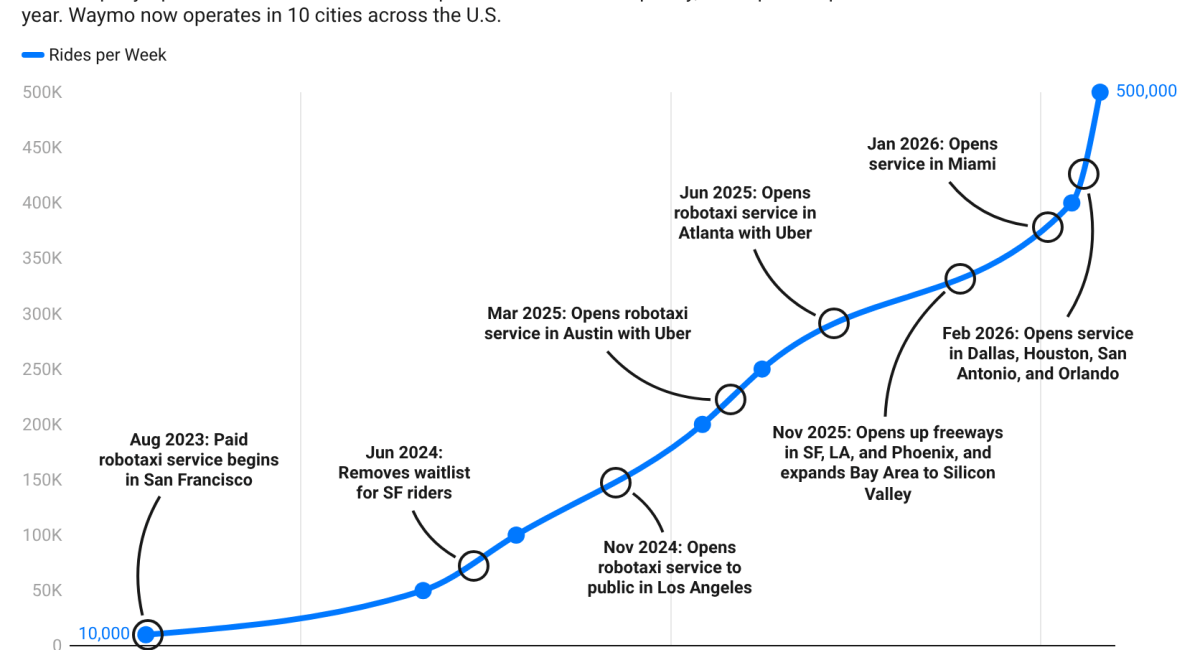 Waymo is now providing 500,000 paid robotaxi rides every week across 10 U.S. cities, the company shared in a post on X this week. The eye-popping figure is reflective of the Alphabet-owned company’s accelerated commercial expansion. But it’s Waymo’s rate of growth in ridership and markets that offers a more compelling story.