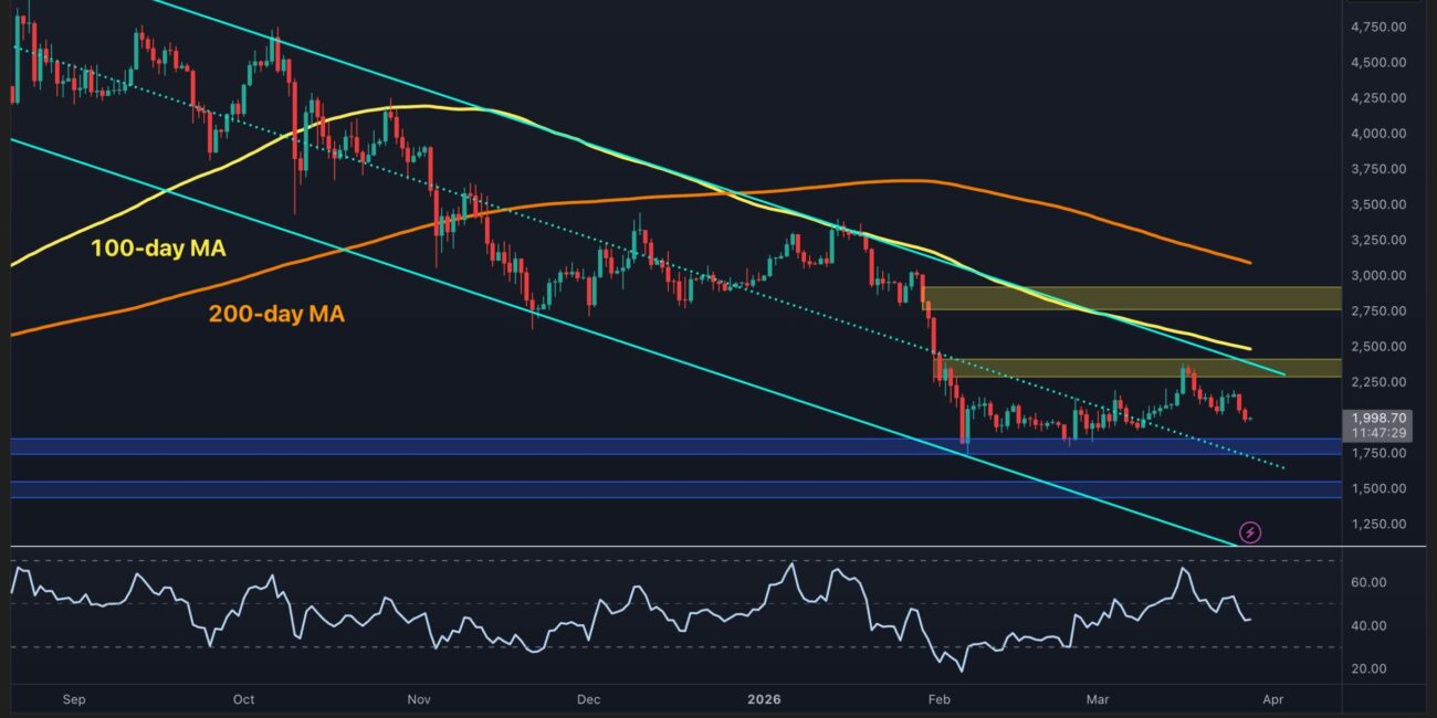 On the daily timeframe, ETH remains firmly below the 100-day and 200-day moving averages, which are located around the $2.5k and $3.1k levels, respectively. Both moving averages are trending downward and acting as dynamic resistance overhead. The overall structure is also still characterized by lower highs, and the recent bounce has not been strong enough to break out of the descending channel pattern.